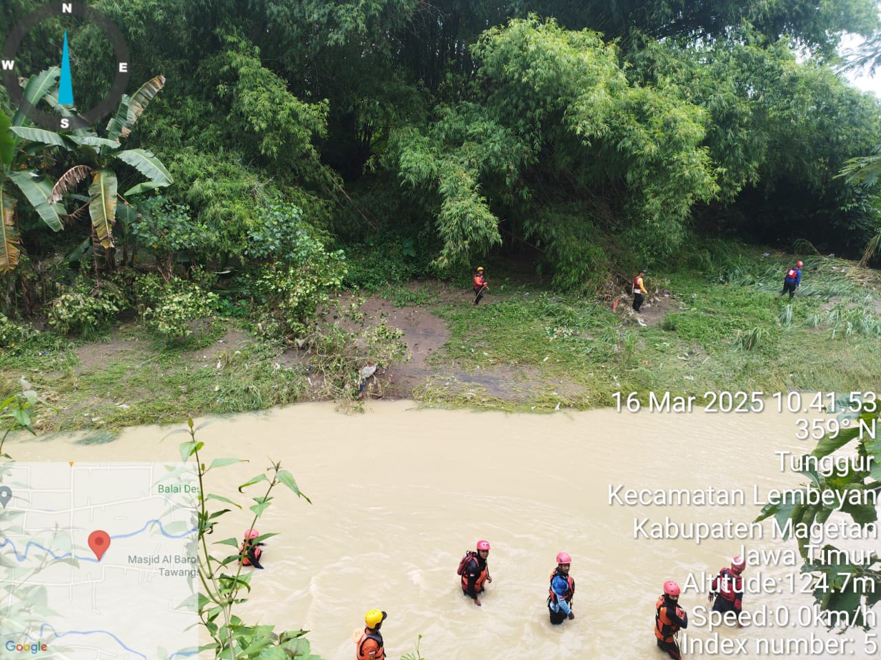 Magetan, BASARNAS – Adytya Yoga Pratama (23) ditemukan tim SAR gabungan sudah dalam kondisi meninggal, pada Senin (17/3/2025) di sungai Mermo, yang melintas di desa Lembeyan Wetan, kecamatan Lembeyan, kabupaten Magetan.