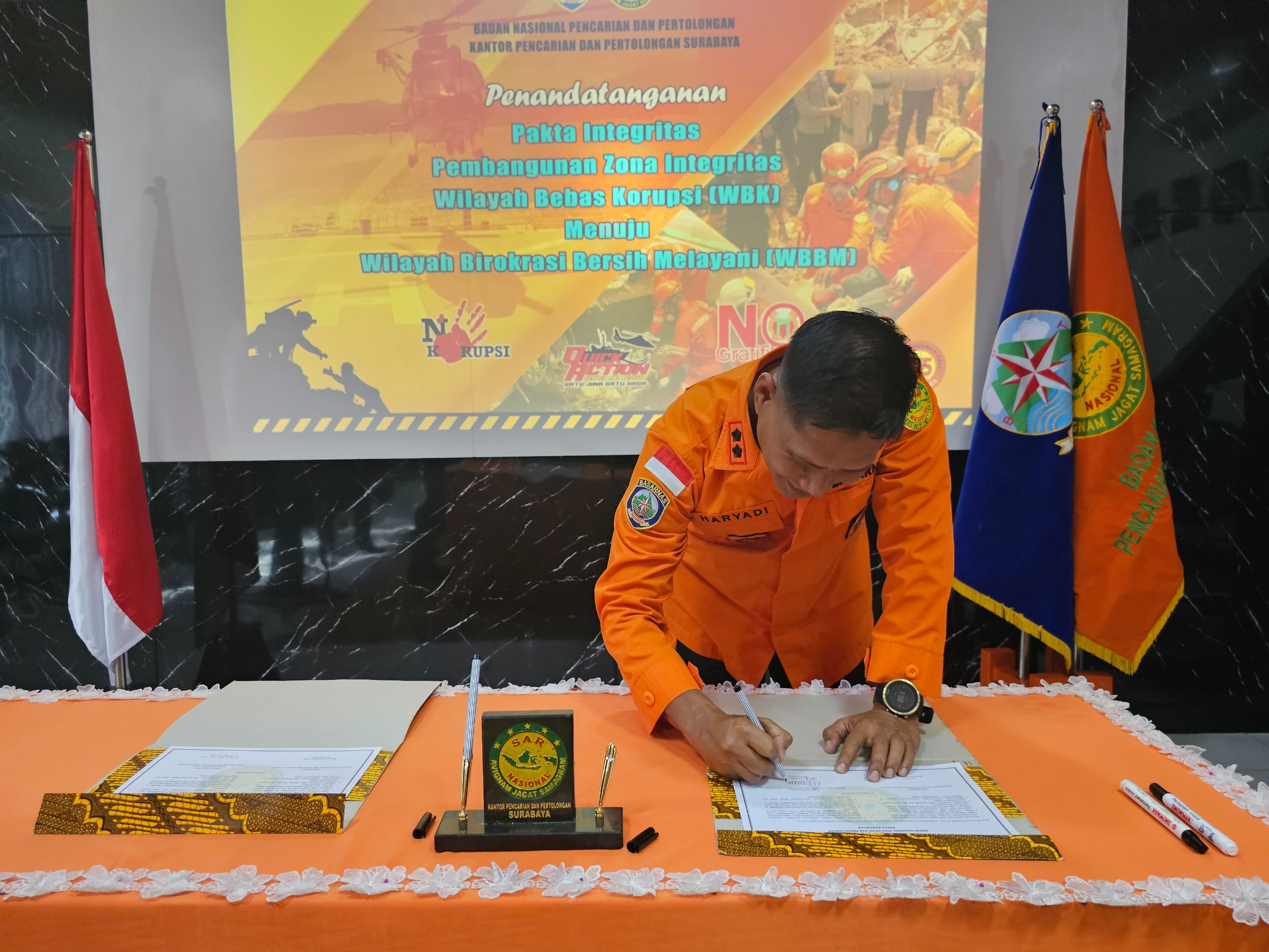 Dalam sambutannya, Kepala Kantor SAR Surabaya, Muhamad Hariyadi mengatakan, kegiatan penandatanganan Pakta Integritas ini dimaksudkan sebagai upaya Kantor SAR Surabaya yang telah mendapatkan predikat WBK untuk menuju WBBM.