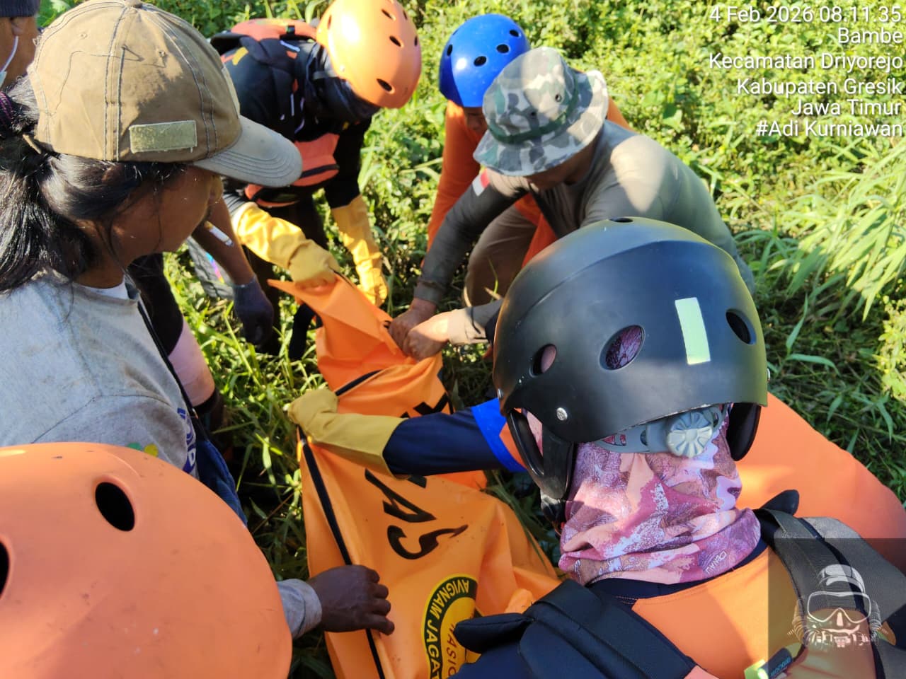 Pada hari kedua pencarian, Rabu (4/2/2026), sekitar pukul 08.50 WIB, Tim SAR Gabungan berhasil menemukan korban, dengan jarak kurang lebih 1 kilometer dari lokasi kejadian awal. Korban ditemukan dalam keadaan meninggal dunia (MD) dan selanjutnya dievakuasi ke Puskesmas Driyorejo untuk penanganan lebih lanjut.